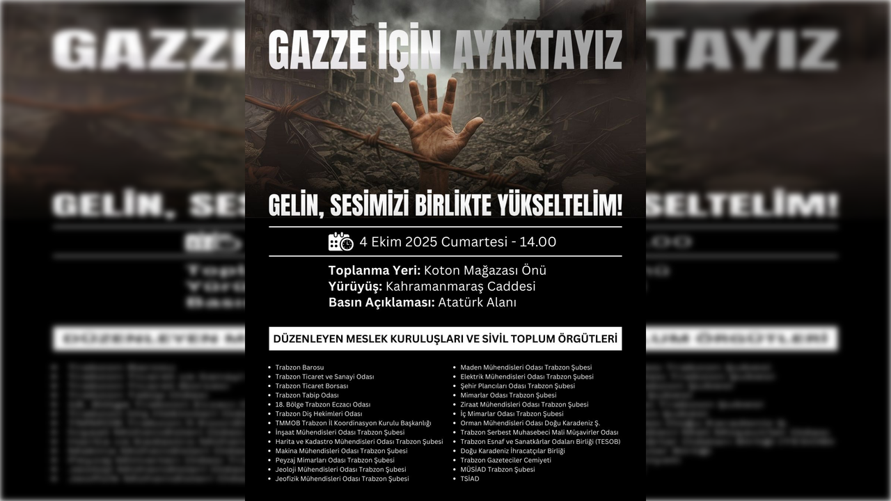 Organizatörler, etkinliğe Trabzon halkının geniş katılım göstermesini beklediklerini belirterek, “Gazze’de yaşananlara karşı sessiz kalmayacağız. Adalet ve özgürlük için sesimizi yükseltmek üzere tüm hemşehrilerimizi yürüyüşümüze davet ediyoruz” ifadelerini kullandı.