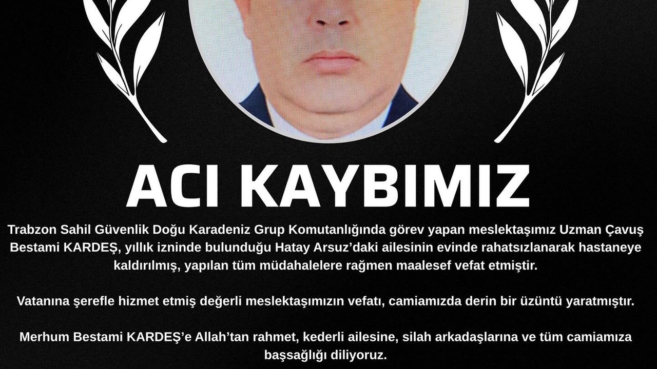Trabzon’da görev yapan güvenlik personelinden üzücü bir haber geldi. Sahil Güvenlik Doğu Karadeniz Grup Komutanlığı’nda görevli Uzman Çavuş Bestami Kardeş, yıllık izninde bulunduğu sırada aniden rahatsızlandı. Hatay’ın Arsuz ilçesindeki evinde fenalaşan Kardeş, yapılan tüm müdahalelere rağmen kurtarılamadı.