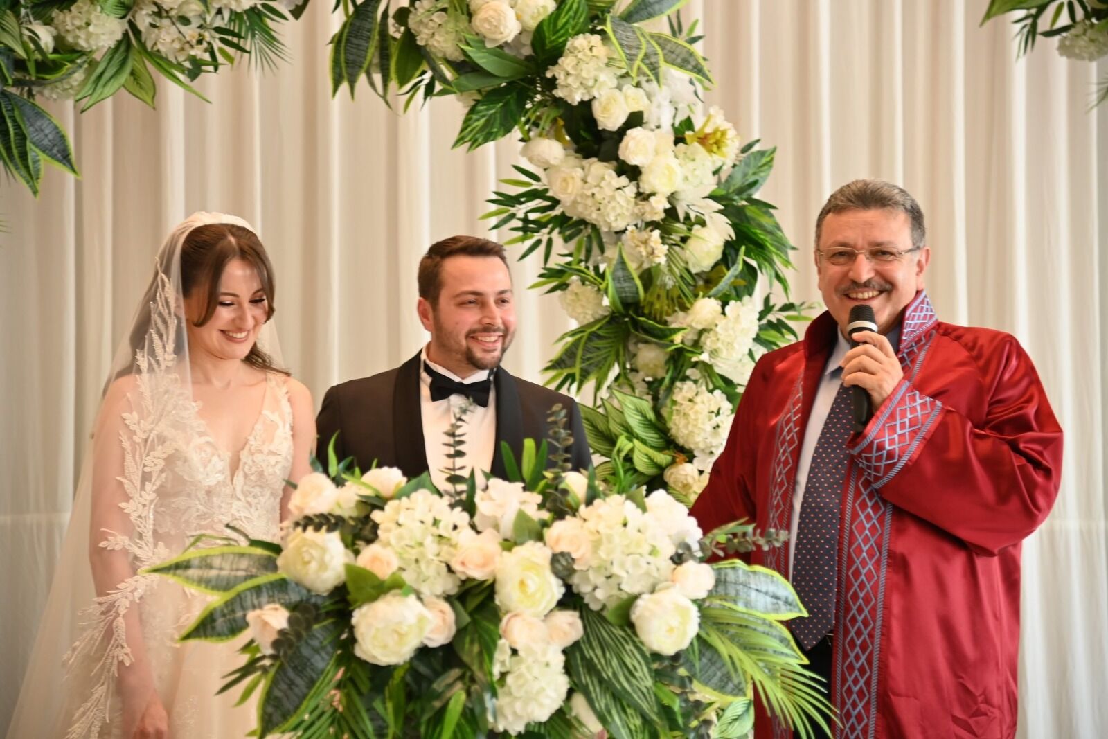 Ardından ise nikah defterini takdimi için Trabzonspor Asbaşkanı Zeyyat Kafkas’ı kürsüye davet eden Genç, Kafkas’ın evlik cüzdanını gelin hanıma vermesinin ardından Trabzon eski milletvekili Ali Kemal Başaran’a ise kutsal kitabımız kuran-ı kerimi damada vermesini istedi. Başaran, duygusal bir konuşma yaptı. Ailenin büyüklerinin bu mutlu ana tanık olamamalarından duyduğu üzüntüyü dile getirdi ve ‘Bilemiyorum ben torunlarımın nikahına kalabilecek miyim’ dedi ve gençlere ömür boyu mutluluklar diledi.