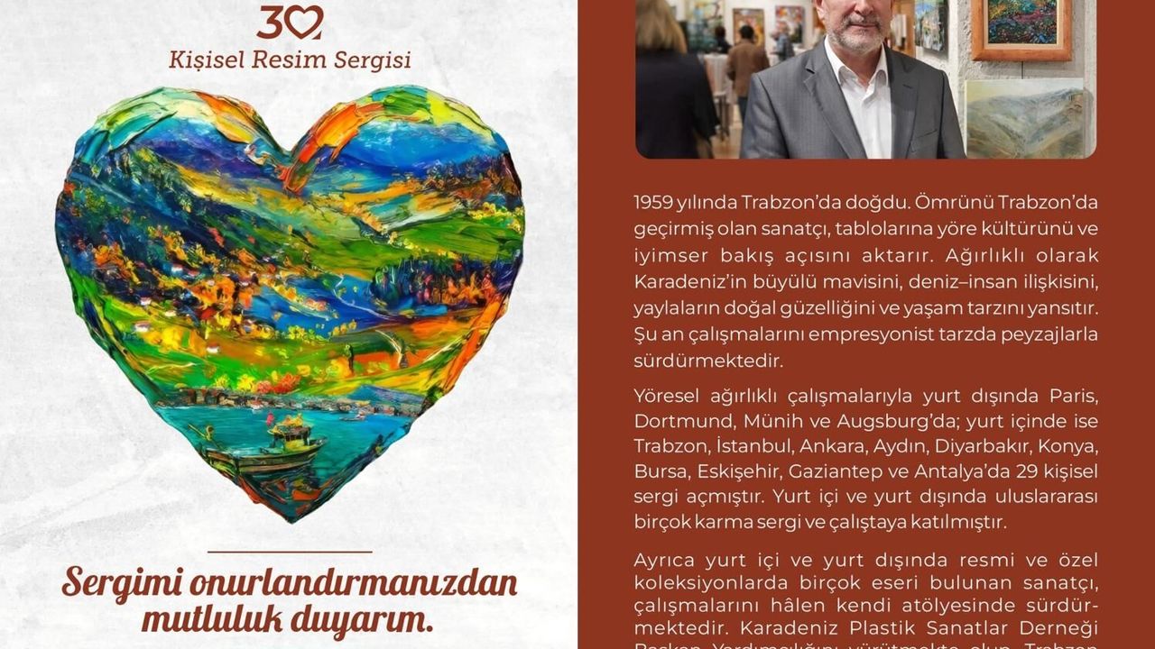 Abdulkadir Yıldırım’ın “Kalbimin Rengi” adlı sergisi, sanatçının uzun yıllara dayanan birikimini ve duygusal dünyasını yansıtıyor. Karadeniz’in doğası, yaşamın içten anları ve insan hikâyeleri, eserlerde belirgin şekilde hissediliyor.