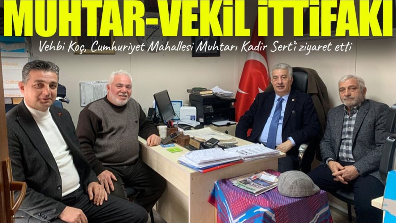 Trabzon’un çalışkan milletvekillerinden Vehbi Koç, Cumhuriyet Mahallesi Muhtarı Kadir Sert’i ziyaret ederek sosyal dayanışma ve mahalle yönetimindeki özverili çalışmalarından dolayı tebrik etti. Kış aylarında vatandaşlarını yalnız bırakmayan, kömür ve sıcak yemek yardımlarını bizzat ulaştıran Muhtar Sert, örnek davranışlarıyla takdir topladı.