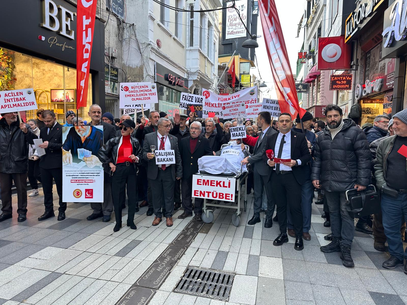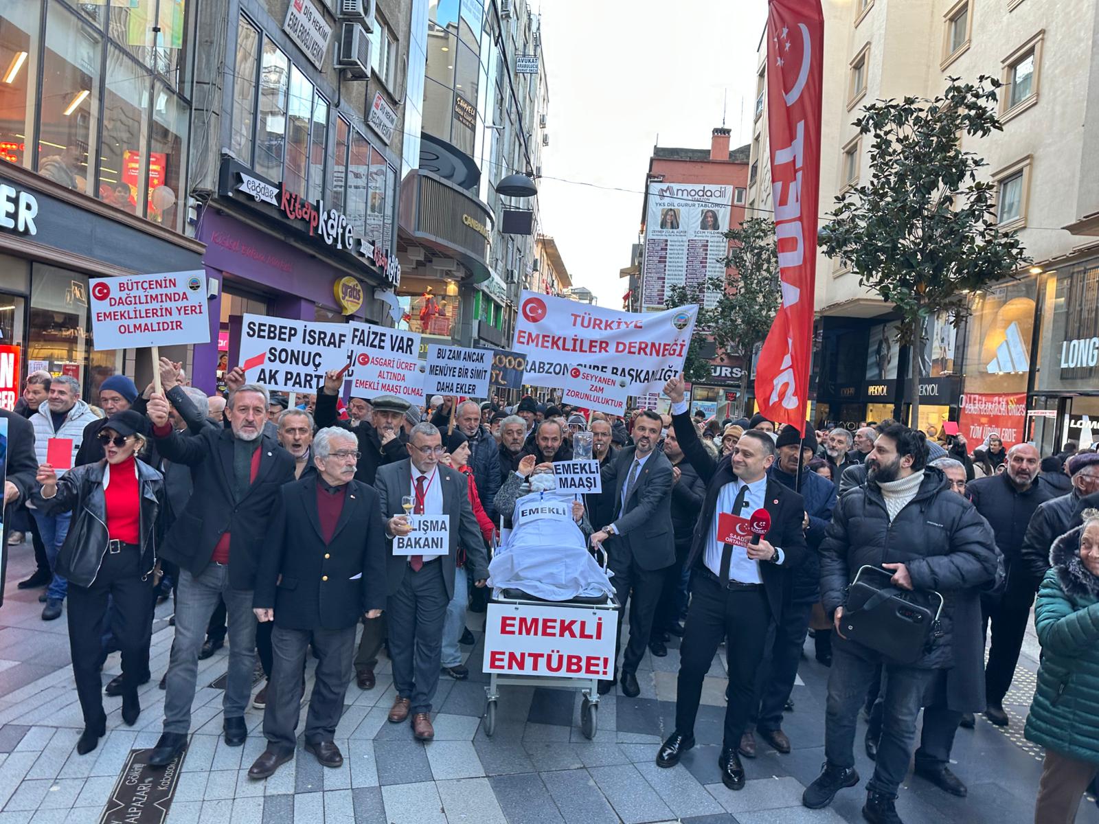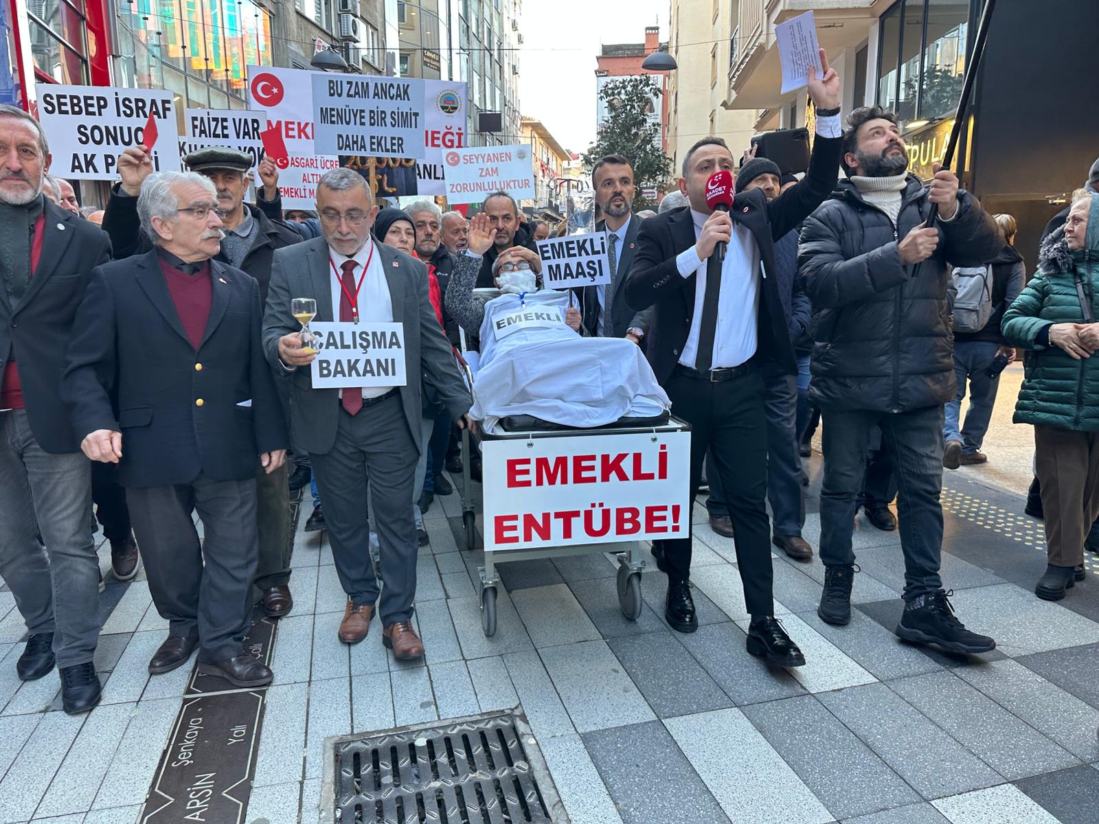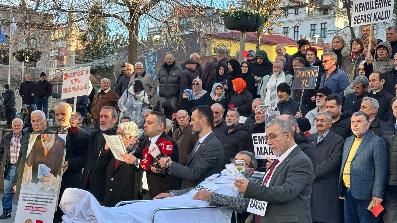 Trabzon’un en işlek noktalarından biri olan Uzunsokak, bugün ekonomik zorluklara karşı yükselen bir sese şahitlik etti. Türkiye Emekliler Derneği Trabzon Şubesi ile Saadet Partisi Ortahisar İlçe Teşkilatı, emekli maaşlarının açlık sınırının altında kalmasına dikkat çekmek amacıyla bir araya geldi. Bir sedye üzerine yatırılan temsili emekli figürüyle gerçekleştirilen "Emekli Entübe" yürüyüşü, çevredeki vatandaşların yoğun ilgisini çekti. Yürüyüşün ardından Meydan Parkı’nda toplanan kalabalığa hitap eden Saadet Partisi Ortahisar İlçe Başkanı Burak Turhan, sert açıklamalarda bulunarak emeklilerin içinde bulunduğu durumu "vatandaş kıyımı" olarak nitelendirdi.