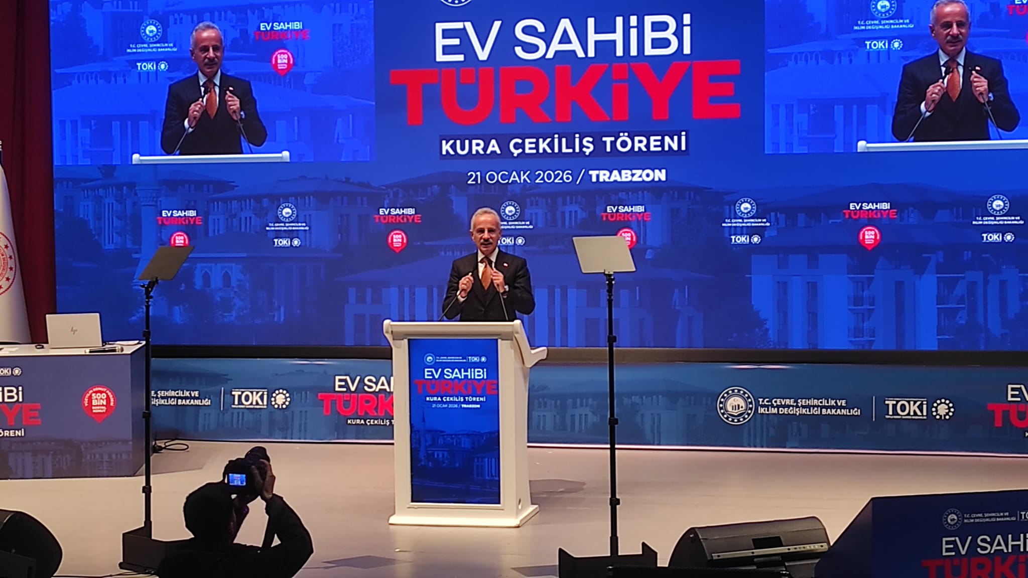 Trabzon’da TOKİ tarafından yapılacak 3 bin 734 konutun hak sahiplerini belirlemek amacıyla düzenlenen kura çekiliş töreni, Karadeniz Teknik Üniversitesi Atatürk Kültür Merkezi’nde büyük bir katılımla gerçekleştirildi. Törene; Ulaştırma ve Altyapı Bakanı Abdülkadir Uraloğlu, TOKİ Başkanı Mustafa Levent Sungur, Trabzon Valisi Tahir Şahin, Trabzon Büyükşehir Belediye Başkanı Ahmet Metin Genç ve birçok yetkili ile vatandaş katıldı. Cumhurbaşkanı Recep Tayyip Erdoğan’ın mesaj gönderdiği törende, şehirdeki konut talebi ve devletin konut politikaları ele alındı.