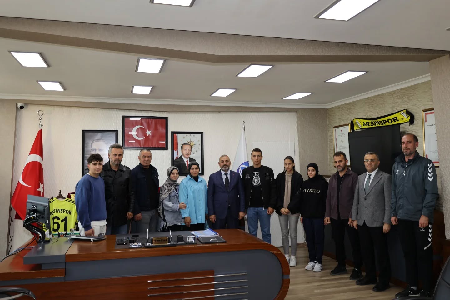 Arsinspor Futbol Şube Sorumlusu İbrahim Mandıralı, Arsin Mesleki ve Teknik Anadolu Lisesi Beden Eğitimi Öğretmeni Murat Kahveci ve sporcu öğrencileri Arsin Belediye Başkanı Hamza Bilgin’i Arsin Belediyesini ziyaret ettiler. Ziyarette Başkan Bilgin, “Nazik ziyaretleri için kendilerine teşekkür ediyorum ” ifadelerini kullandı.