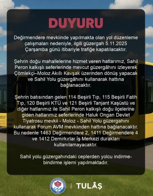 Trabzon’un en yoğun ulaşım noktalarından biri olan Değirmendere bölgesinde yapımı devam eden Akıllı Kavşak projesinde sona yaklaşıldı. Son aşamaya geçilmesiyle birlikte 5 Kasım 2025 itibarıyla bazı ana yollar geçici olarak trafiğe kapatıldı. Karayolu ulaşımında yaşanan bu değişiklik, hem özel araç sürücülerini hem de toplu taşıma kullanıcılarını etkiledi. Trafik akışının yeniden düzenlendiği bu süreçte, TULAŞ da otobüs hatlarında geçici güzergâh değişikliklerine gitti. Sabah saatlerinde bölgede ciddi yoğunluk yaşanırken, yetkililer sürücüleri alternatif güzergâhları kullanmaları konusunda uyardı. Peki hangi yollar kapandı? Hangi otobüs durakları devre dışı bırakıldı? İşte ayrıntılar…