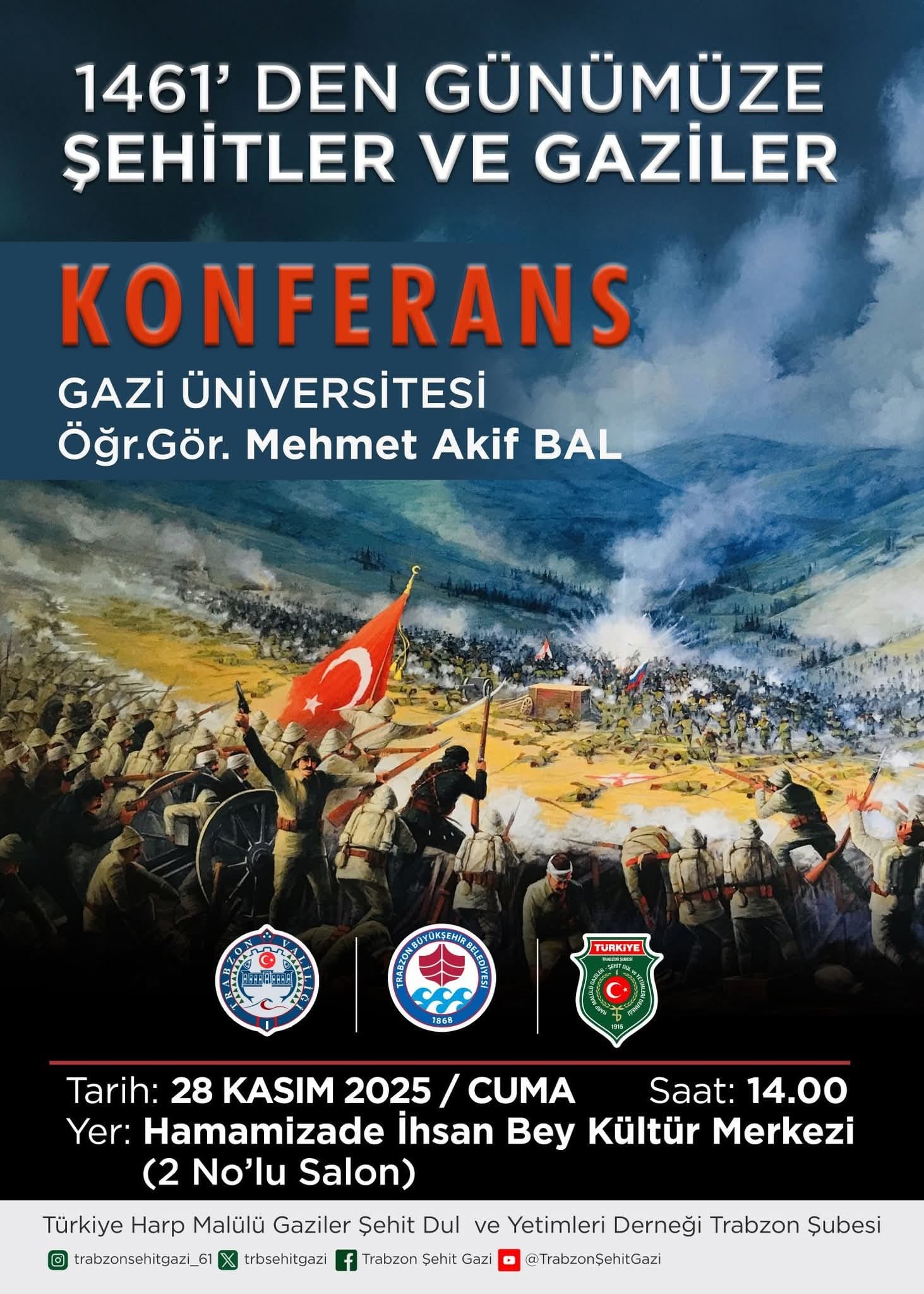 Trabzon, vatan mücadelesinde verdiği sayısız şehit ve gazisiyle Türkiye’nin en kadim ve en güçlü hafızalarından birine sahip şehirlerin başında geliyor. Bu köklü mirası yaşatmak amacıyla düzenlenen “1461’den Günümüze Şehitler ve Gaziler” başlıklı konferans, 28 Kasım 2025 Cuma günü Hamamizade İhsan Bey Kültür Merkezi 2 No’lu Salonda gerçekleştirilecek. Programda Gazi Üniversitesi Öğr. Gör. Mehmet Akif Bal konuşmacı olarak yer alacak. Türkiye Harp Malulü Gaziler Şehit Dul ve Yetimleri Derneği Trabzon Şube Başkanı Ahmet Tezcan, tüm vatandaşları davet ederek önemli mesajlar verdi. Bu özel buluşma, Trabzon’un tarihsel hafızasına ışık tutarken aynı zamanda toplumsal birlik ve vefa duygusunu güçlendirmeyi amaçlıyor.