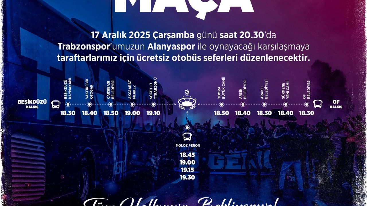 Trabzon Büyükşehir Belediyesi, bu akşam Akyazı Stadı’nda oynanacak Trabzonspor–Alanyaspor Ziraat Türkiye Kupası karşılaşması için taraftarlara ücretsiz otobüs seferleri sağlayacak.