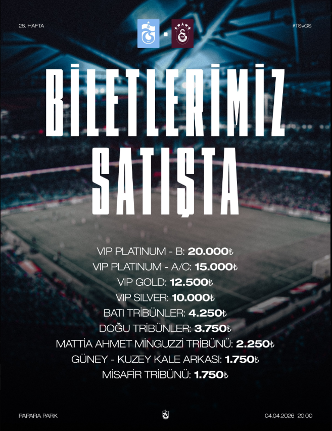 Papara Park'ta saat 20.00'de başlayacak karşılaşmanın biletleri VIP Platinum -B: 20 bin, VIP Platinum A/C: 15 bin, VIP Gold 12 bin 500, VIP Silver 10 bin, Batı Tribünler 4 bin 250, Doğu Tribünler 3 bin 750, Mattia Ahmet Minguzzi Tribünü 2 bin 250, Güney-Kuzey Kale Arkası ve Misafir Tribün biletleri 1750 lira olarak satışa sunuldu.