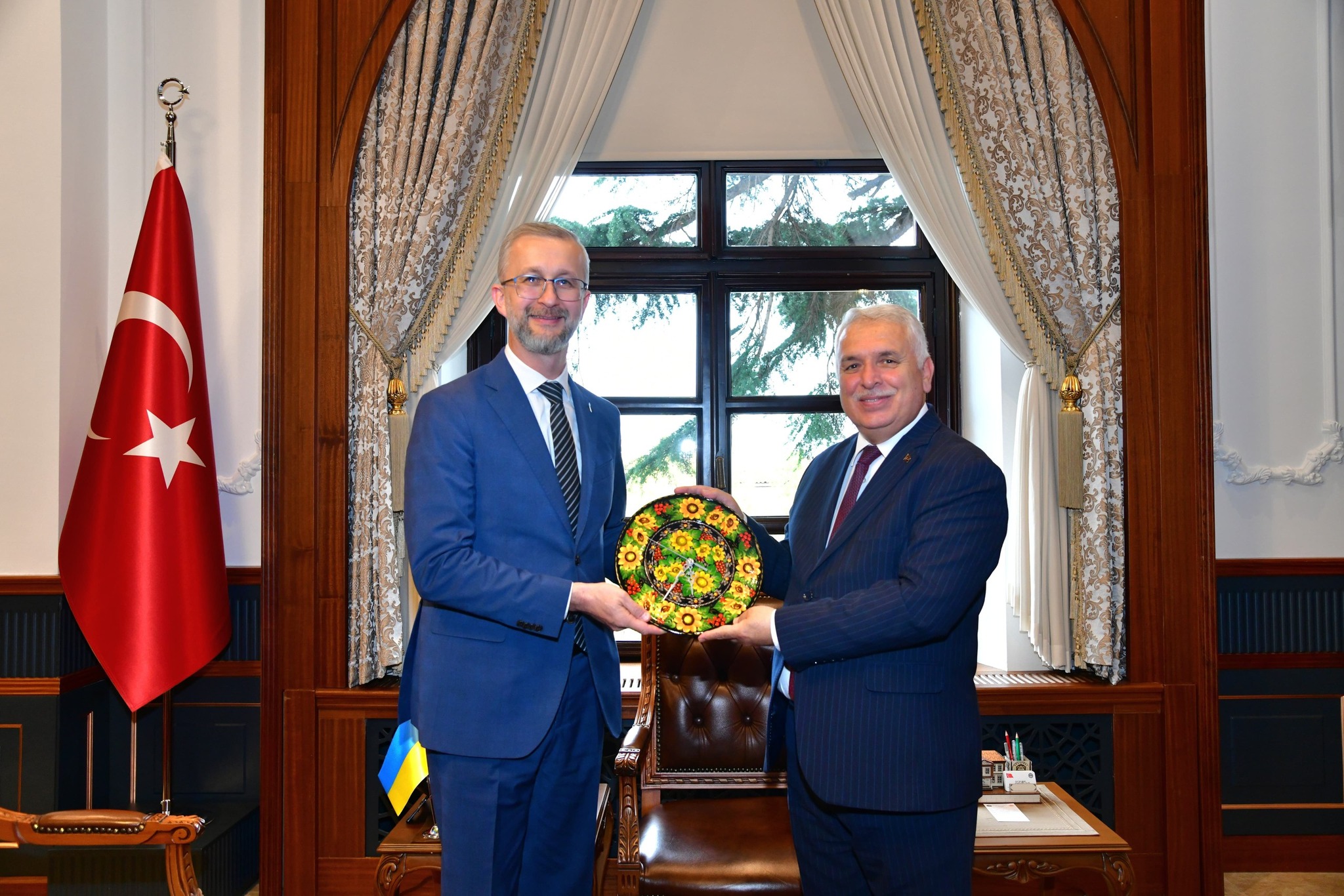 Trabzon Valisi Aziz Yıldırım, Ukrayna’nın Ankara Büyükelçisi Nariman Celalov’u makamında kabul etti. Ziyarette, iki ülke arasındaki dostane ilişkiler ile Trabzon ve Ukrayna arasındaki ticari, kültürel ve turizm alanlarındaki iş birliği imkânları üzerine istişarelerde bulunuldu. Vali Yıldırım, Büyükelçi Celalov’a ziyaretinden dolayı teşekkür ederek, Trabzon’un sahip olduğu tarihi, kültürel ve ekonomik potansiyel hakkında bilgi verdi. Büyükelçi Celalov ise misafirperverliğinden dolayı Vali Yıldırım’a teşekkür etti.
