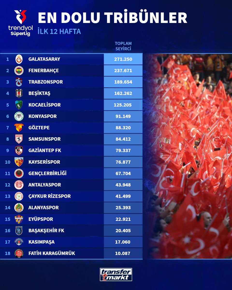 Süper Lig’de hemen her geçen hafta tribünlere olan ilgi azalırken Trabzonspor oldukça olumlu bir kararla bilet fiyatlarını düşürerek stada olan ilgiyi artırmaya gayret etmiş Alanya ve Eyüp maçlarında taraftar ilgisi artmıştı. Trabzonspor bu sezon ilk 12 hafta itibariyle 189 bin 671 seyirci sayısı ile Galatasaray ve Fenerbahçe’den sonra en fazla seyirci sayısına sahip 3. takım konumunda. Trabzonspor’dan sonra 162 bin 262 ile Beşiktaş geliyor. Boedo-Mavililerde ligin başında gurbetçilerin olduğu dönemde maça olan ilgi yüksekti. Okulların açılması ve gurbetçilerin de dönmesiyle sayı düşmüştü. Kocaelispor ligde en fazla seyirci sayısında 5. Sırayı alırken Konyaspor 6 sırada. Galatasaray 271 bin Fenerbahçe ise 237 bin taraftarda kaldı.
