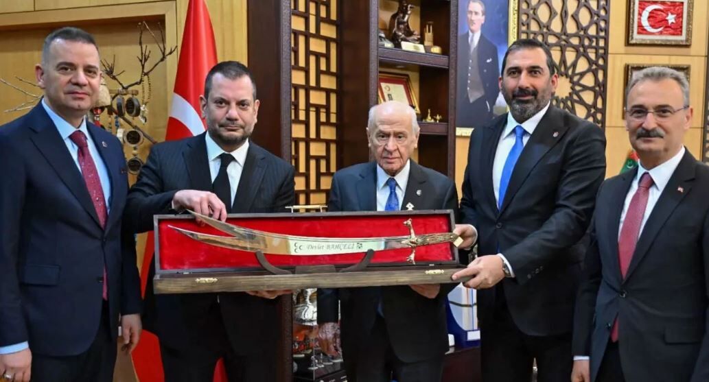 Gerçekleştirilen görüşmede, Devlet Bahçeli'ye 1975-1976 sezonunu simgeleyen retro beyaz formanın yanı sıra, özel işlemeli bir kılıç da takdim edildi.
