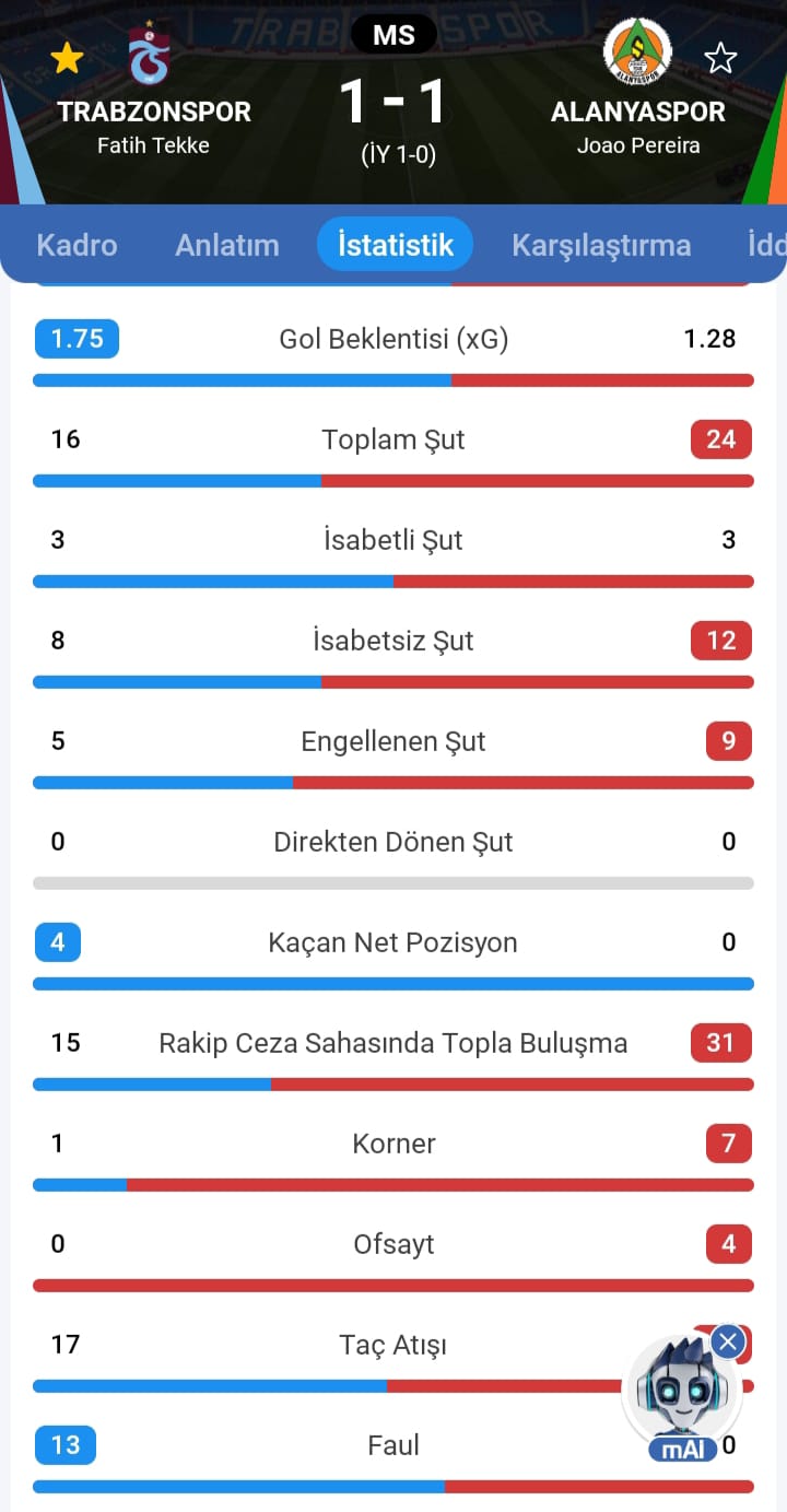 Trabzonspor bir iç saha maçında göre inanılmaz negatif bir istatistik ortaya koydu. Alanyaspor adeta bir büyük takım gibi oynarken Trabzonspor’a karşı tüm istatistiklerde üstünlük kurdu.