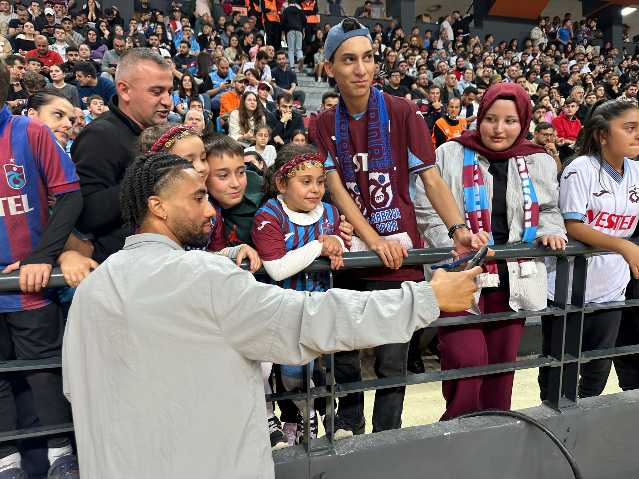Trabzonspor taraftarı, futbolcuların salondaki varlığını “Bordo-Mavi Tek Yürek” tezahüratlarıyla karşıladı.