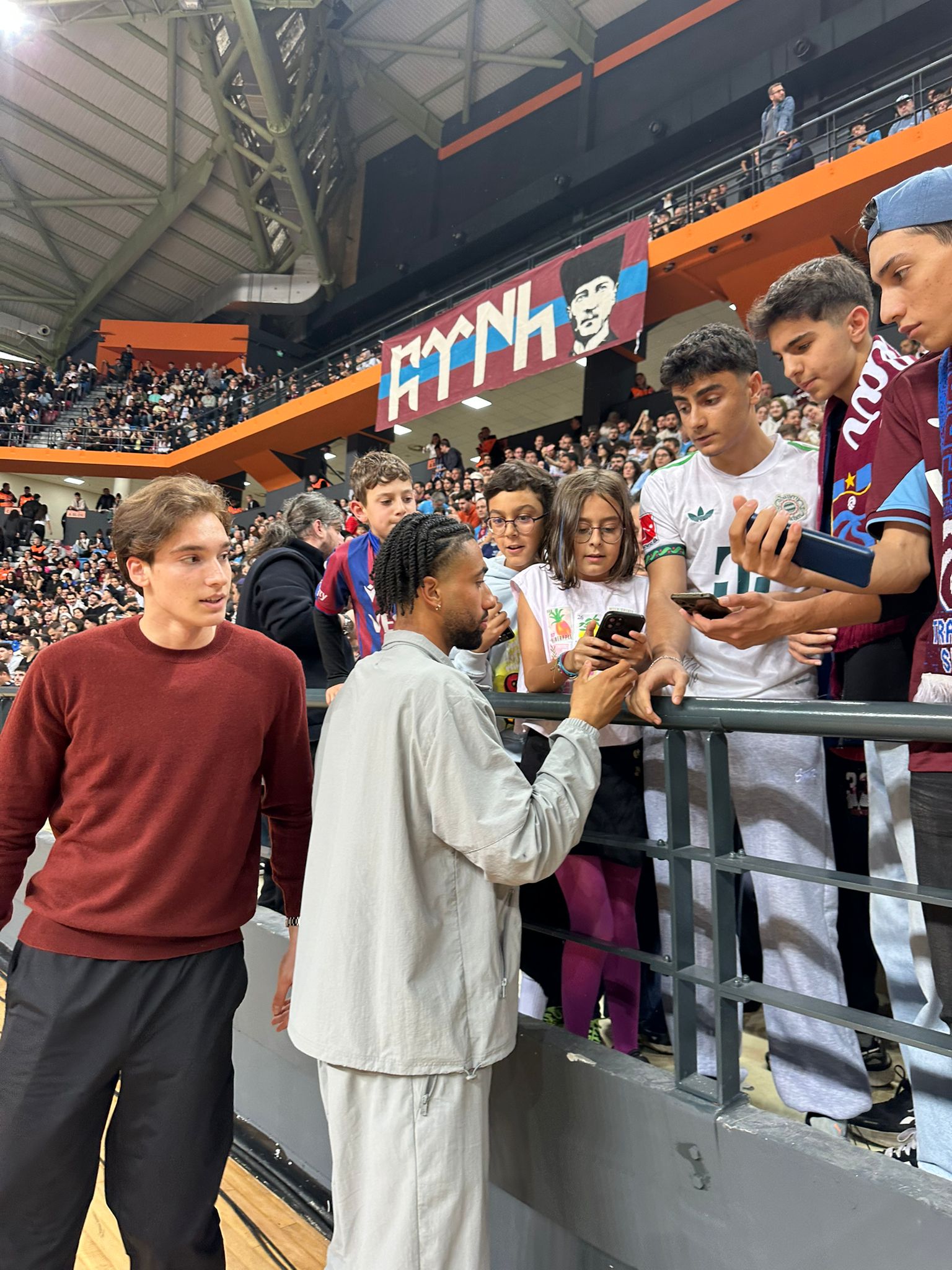 Maçın başlamasından kısa süre önce salona giriş yapan futbolcular, taraftarlardan yoğun ilgi gördü.
