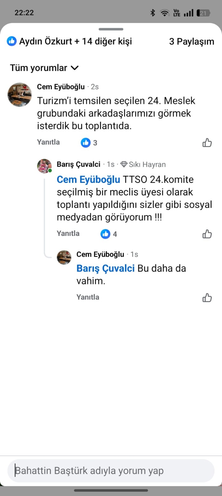 Toplantıya çağrılmayan 24. Komite üyeleri ve eski meclis üyeleri, duruma sosyal medya üzerinden tepki gösterdi. Eski TTSO meclis üyesi Cem Eyüboğlu, “Turizmi temsilen seçilen 24. Meslek grubundaki arkadaşlarımızı da bu toplantıda görmek isterdik” ifadelerini kullandı.