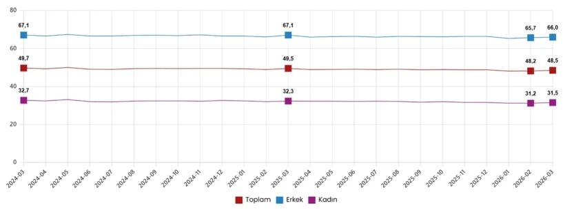 İşgücüne katılma oranı 0,1 puanlık artışla yüzde 52,8 olarak gerçekleşti. Erkeklerde bu oran yüzde 70,8 olurken, kadınlarda yüzde 35,3 seviyesinde kaldı. Bu durum, işgücü piyasasına katılımın artmasına rağmen cinsiyetler arası farkın sürdüğüne işaret etti.