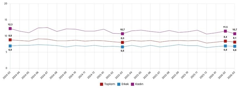 Türkiye İstatistik Kurumu tarafından açıklanan Mart 2026 işgücü istatistikleri, işsizlik oranında gerilemenin devam ettiğini ortaya koydu. Mevsim etkisinden arındırılmış verilere göre işsizlik oranı bir önceki aya kıyasla 0,3 puan azalarak yüzde 8,1 seviyesine düştü.