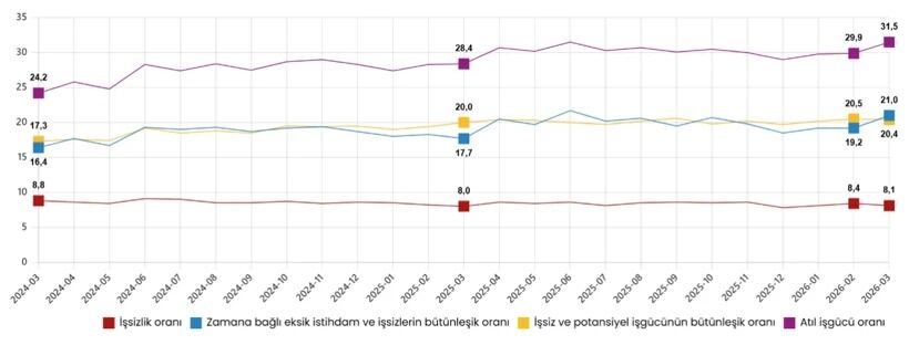 İşgücü piyasasında dikkat çeken bir diğer veri ise atıl işgücü oranındaki artış oldu. İşsizler, zamana bağlı eksik istihdam ve potansiyel işgücünü kapsayan atıl işgücü oranı 1,6 puan artarak yüzde 31,5’e yükseldi.