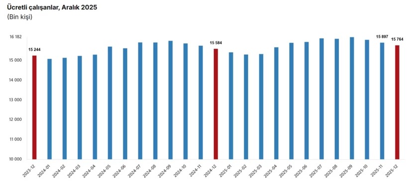 Aralık 2025 itibarıyla ücretli çalışan sayısı 15 milyon 700 binin üzerine çıkarak yıllık bazda yüzde 1,2 artış kaydetti. Bu artış, özellikle hizmet ve inşaat sektörlerindeki istihdam hareketliliğinden kaynaklandı.