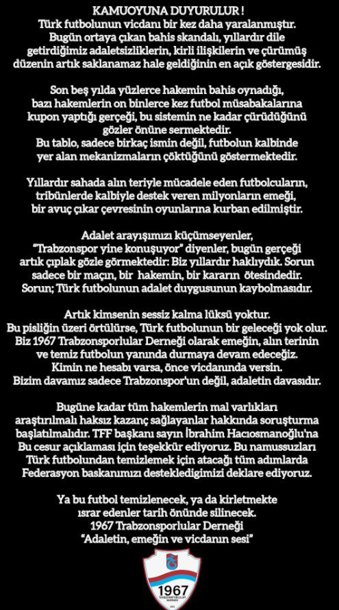 1967 Trabzonsporlular Derneği, tüm hakemlerin mal varlıklarının araştırılması ve haksız kazanç sağlayanlar hakkında soruşturma başlatılması çağrısında bulundu. Türkiye Futbol Federasyonu Başkanı İbrahim Hacıosmanoğlu’nun cesur açıklamalarına teşekkür eden dernek, federasyonun bu konuda atacağı tüm adımları destekleyeceklerini deklare etti.
