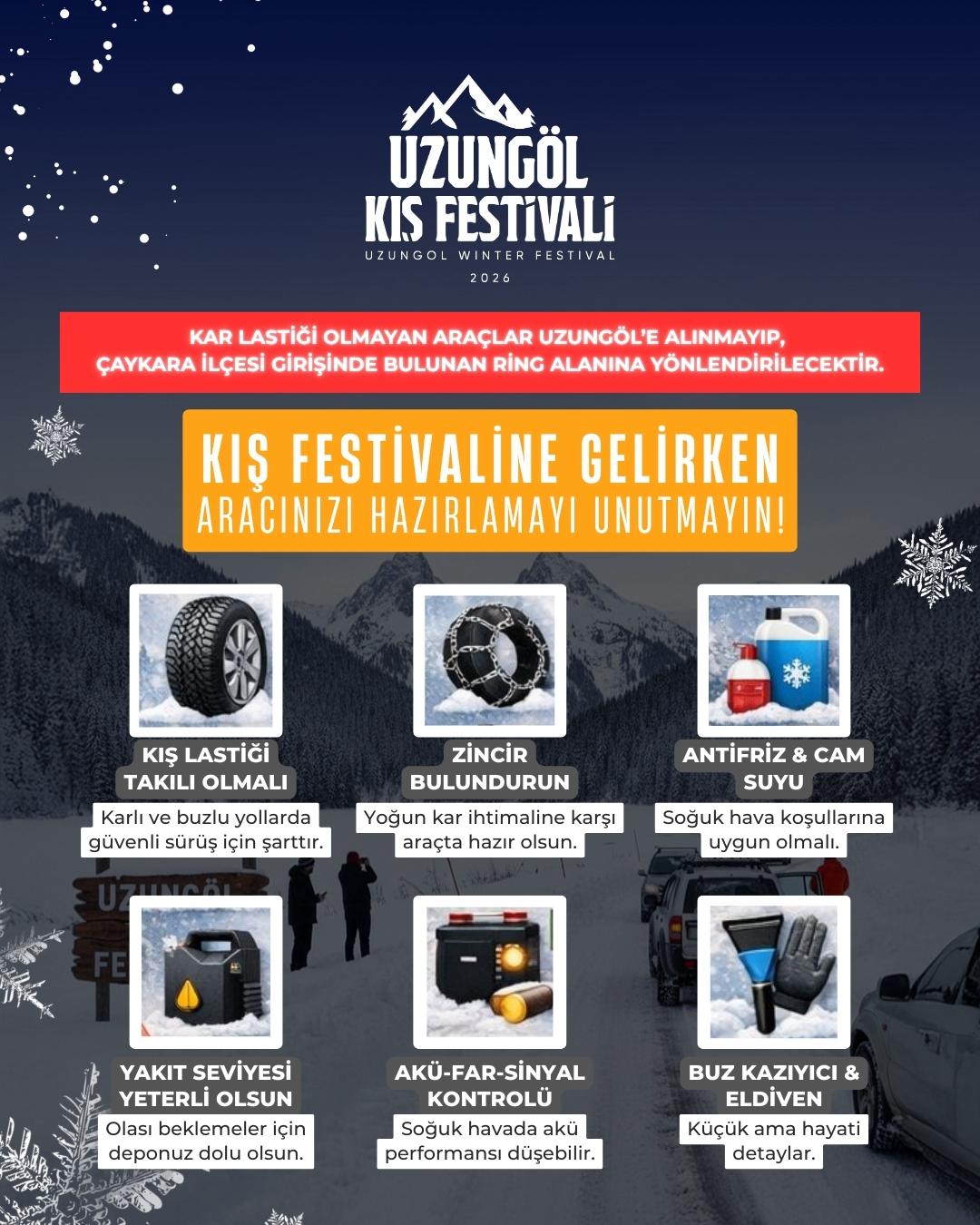 “Misafirlerimizin güvenliği ve ulaşımın aksamaması için alınan bu karara uyulmasını rica ederiz. Amacımız, festival coşkusunun herhangi bir kaza veya mağduriyet yaşanmadan, en güvenli şekilde deneyimlenmesidir. Araçlarınızda mutlaka kış ekipmanlarını bulundurunuz.”