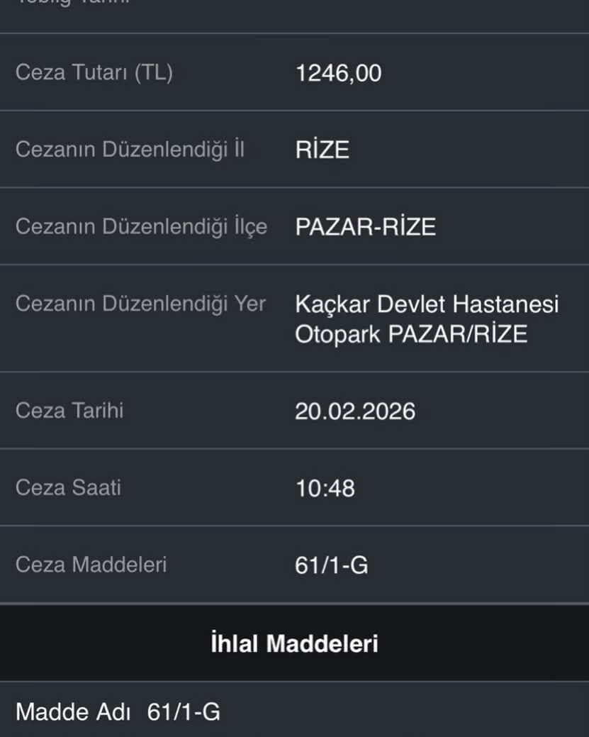 Trafik cezaları vatandaşın belini öyle bükecek noktaya geldi ki, artık araç sahipleri arabalarını kullanmaya korkar oldu. Rize'de hastalanan bir vatandaş, Kaçkar Devlet Hastanesi'ne muayene olmaya gider. Otopark dolu olduğundan dolayı aracını hiçbir aracın çıkışını engellemeyecek şekilde kenara park eder. Bir süre sonra e-devletine, hastanenin otopark alanında bin 246 TL'lik hatalı park cezasını görünce beyninden vurulmuşa döner. Hastanenin otopark alanında yediği cezaya isyan eden vatandaş, 'Bu kadar da olmaz' der. Bu trafik cezaları gerçekten vatandaşın canını yakmaya başladı.
