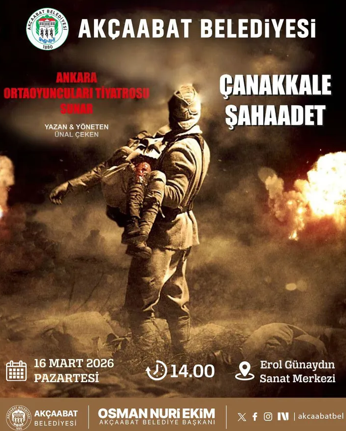 Ankara Ortaoyuncuları Tiyatrosu, Çanakkale Zaferi’ni konu alan “Çanakkale Şahadet” adlı oyunla 16 Mart Pazartesi günü saat 14.00’te Akçaabat’ta sahne alacak. Çanakkale Savaşı’nın sadece bir askeri mücadele değil, bir milletin var oluş destanı olduğunu vurgulayan oyun; vatan sevgisini, fedakarlığı ve sarsılmaz bir imanı sahneye taşıyor. İzleyicileri 1915’in siperlerine, mektupların hüzünlü satırlarına ve Mehmetçiğin devleştiği anlara götürecek olan gösteri, 16 Mart Pazartesi günü saat 14.00’te Erol Günaydın Sanat Merkezi’nde sahnelenecek.
