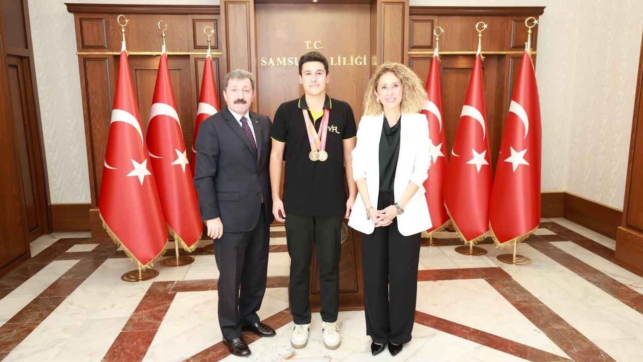 TEKNOFEST finallerinde 'NetQ-AI' ve 'Dinamik-AI' projeleriyle iki farklı kategoride Türkiye birinciliği kazanan BEFO Yazılım Takımı'nın kaptanı, Vezirköprü Hatice-Kemal Kayalıoğlu Fen Lisesi öğrencisi Fatih Altun ve danışman öğretmeni Esra Karamollaoğlu, Vezirköprü Kaymakamı Özgür Kaya, İlçe Milli Eğitim Müdürü Resül Özata ve Okul Müdürü Osman Türkel eşliğinde kabulde yer aldı.