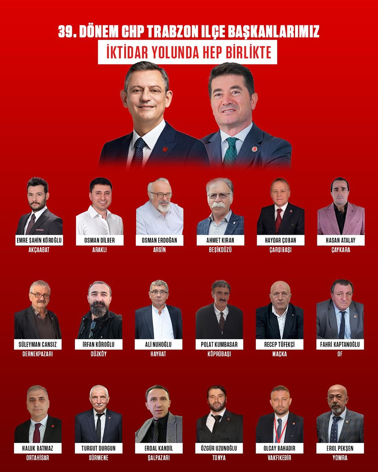 CHP, Trabzon’daki ilçe kongreleri tamamlayarak, görev alacak başkanlarını belirledi. İl Kongresinin 18 Ekim’de yapılması planlanıyor. CHP Akçaabat İlçe Başkanı Emre Şahin Köroğlu, Araklı İlçe Başkanı Osman Dilber, Arsin İlçe Başkanı Osman Erdoğan, Beşikdüzü Belediye Başkanı Ahmet Kıran, Çarşıbaşı İlçe Başkanı Haydar Çoban, Çaykara İlçe Başkanı Hasan Atalay, Dernek Başkanı İlçe Başkanı Süleyman Cansız, Düzköy İlçe Başkanı İrfan Köroğlu, Hayrat İlçe Başkanı Ali Nuhoğlu, Köprübaşı İlçe Başkanı Polat Kumbasar, Maçka İlçe Başkanı Recep Tüfekçi, Of İlçe Başkanı Fahri Kaptanoğlu, Ortahisar İlçe Başkanı Haluk Batmaz, Sürmene İlçe Başkanı Turgut Durgun, Şalpazarı İlçe Başkanı Erdal Kandil, Tonya İlçe Başkanı Özgür Uzunoğlu, Vakfıkebir İlçe Başkanı Olcay Bahadır ve Yomra İlçe Başkanı Erol Haydar Pekşen oldu.