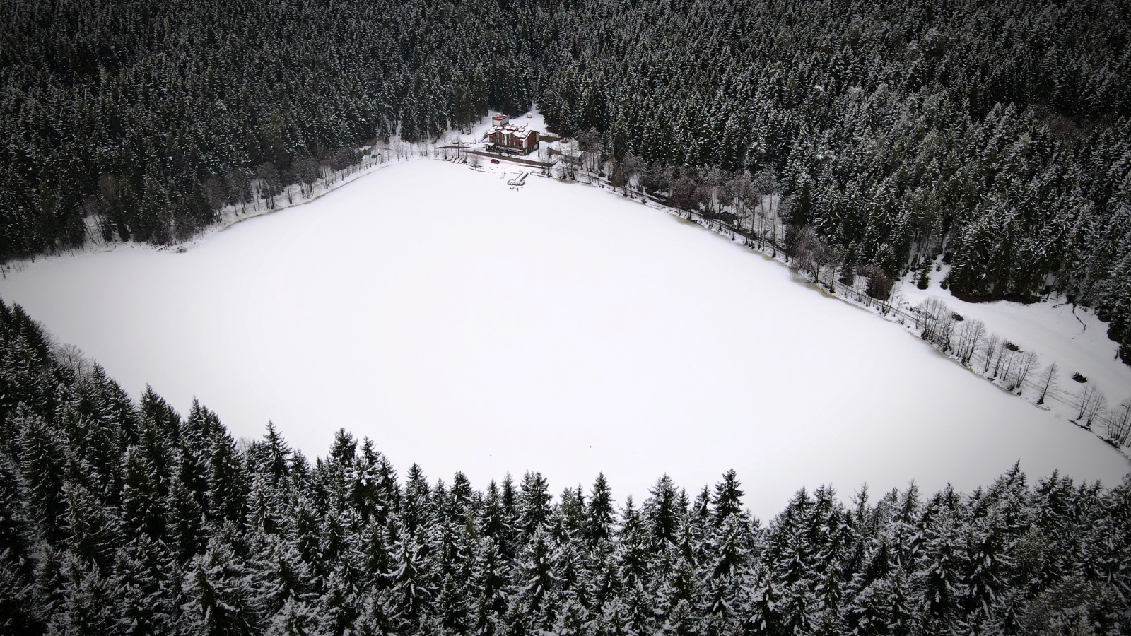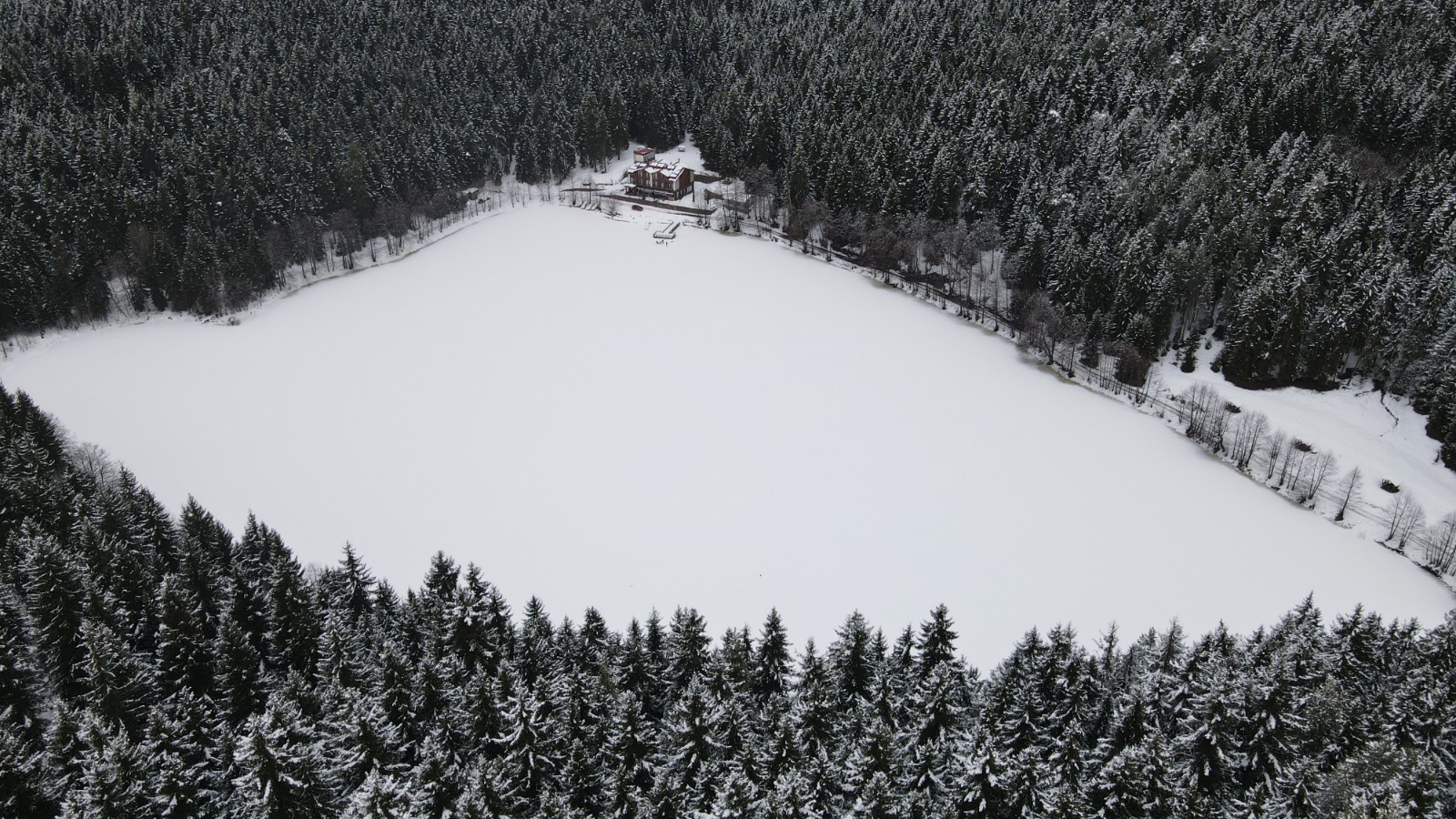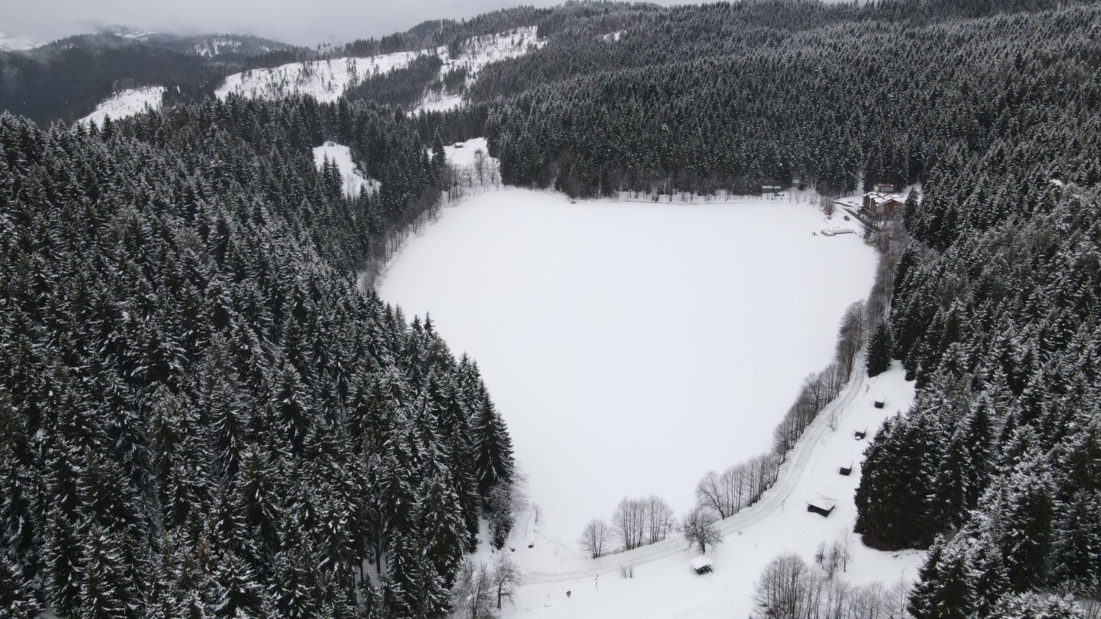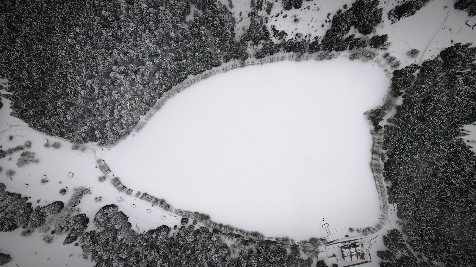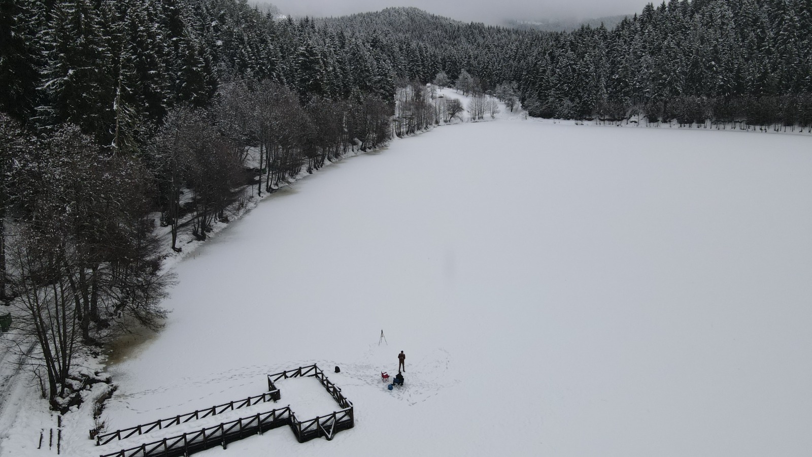Karagöl’ün buz tutmasıyla ortaya çıkan manzara, havadan çekilen görüntülerle daha da etkileyici hale geldi. Dron ile kaydedilen karelerde, beyaz örtü altındaki göl ve çevresindeki yoğun orman dokusu net şekilde görülüyor. Doğal sınırları belirginleşen göl, kışın yalın ve güçlü güzelliğini yansıtıyor.