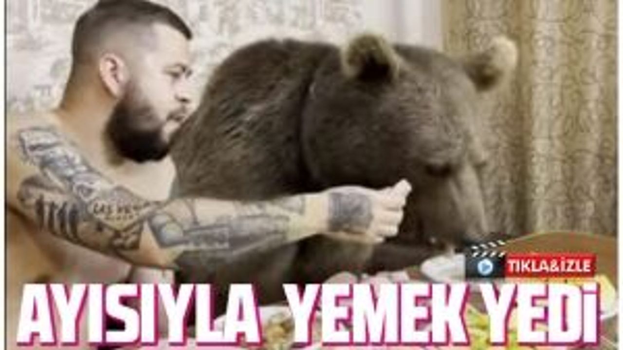 Rusya'da ayısıyla birlikte yemek yiyerek, çizgi film izledi