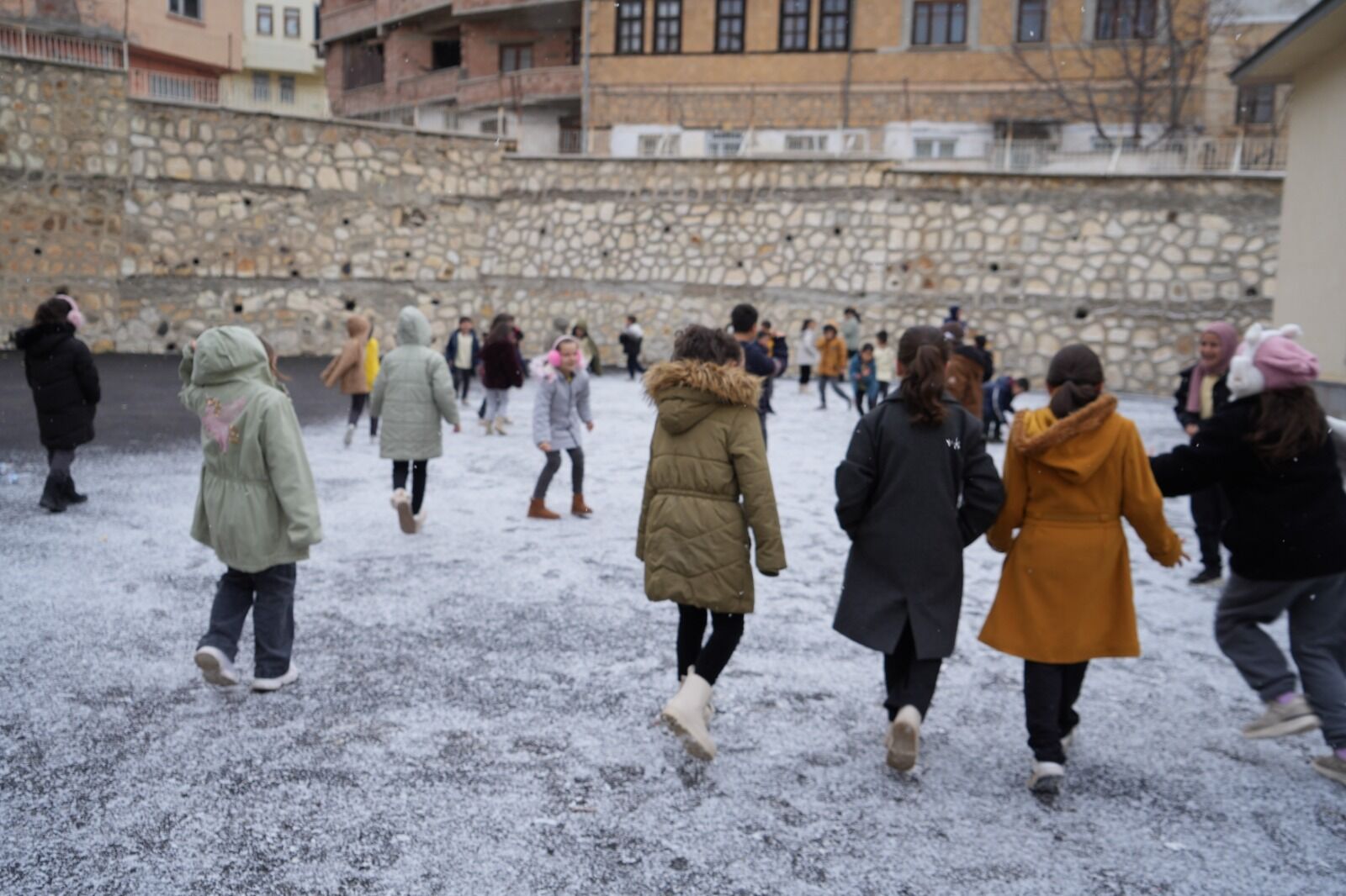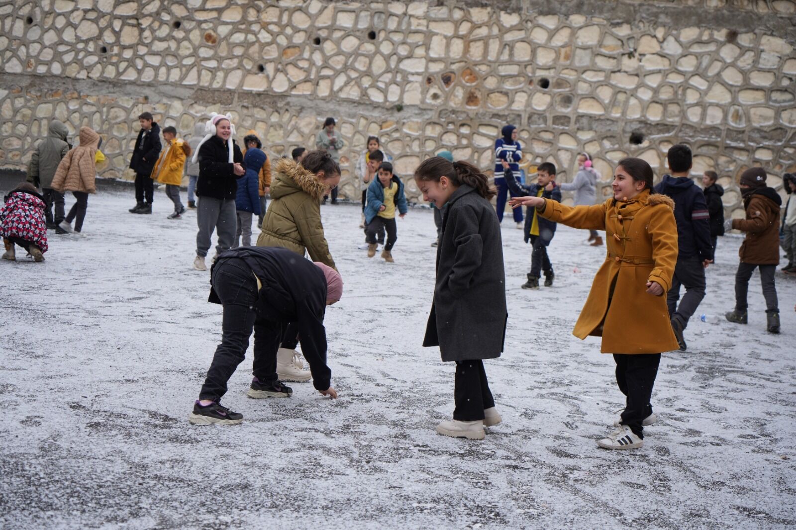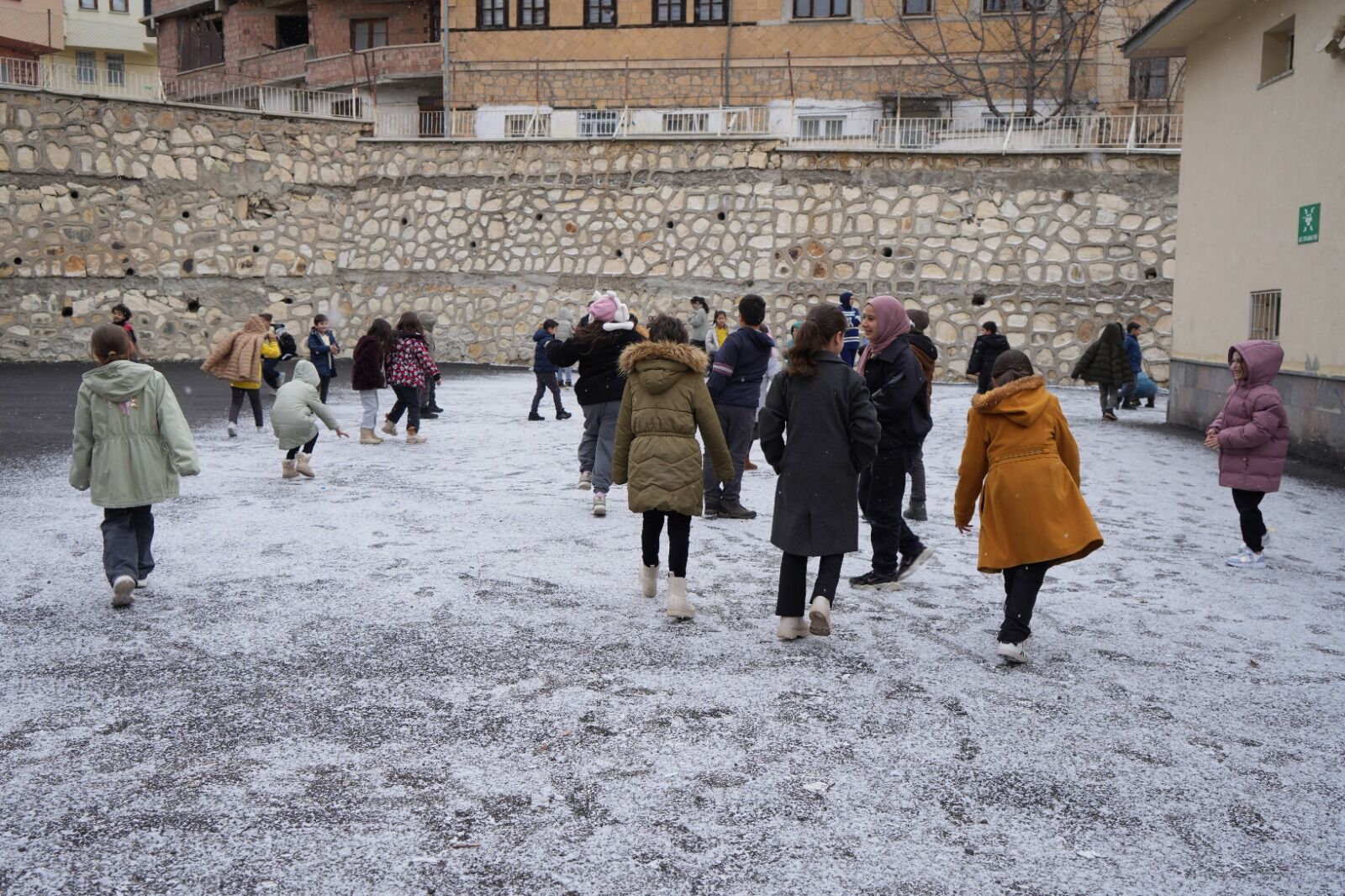 Öğrenciler karla buluşunca okul bahçesi şenlendi