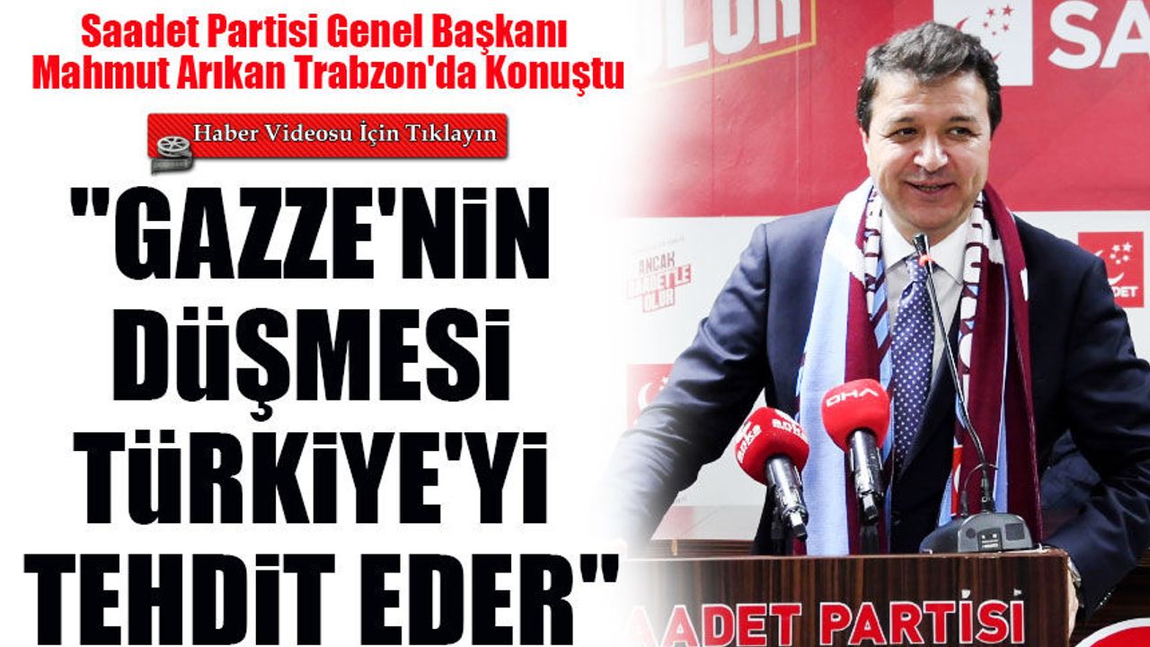 Saadet Partisi Genel Başkanı Mahmut Arıkan, Trabzon’da yaptığı açıklamada Gazze'nin düşmesinin Türkiye'nin beka sorunu olacağını ve Kıbrıs'ın da tehdit altına gireceğini söyledi.