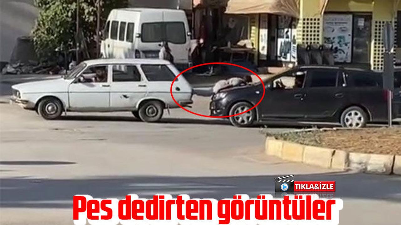 Adana’nın Kozan ilçesinde bozulan bir otomobili çekmek için halat bulamayan şahısların bir çocuğu halat gibi kullanması anbean görüntülendi.