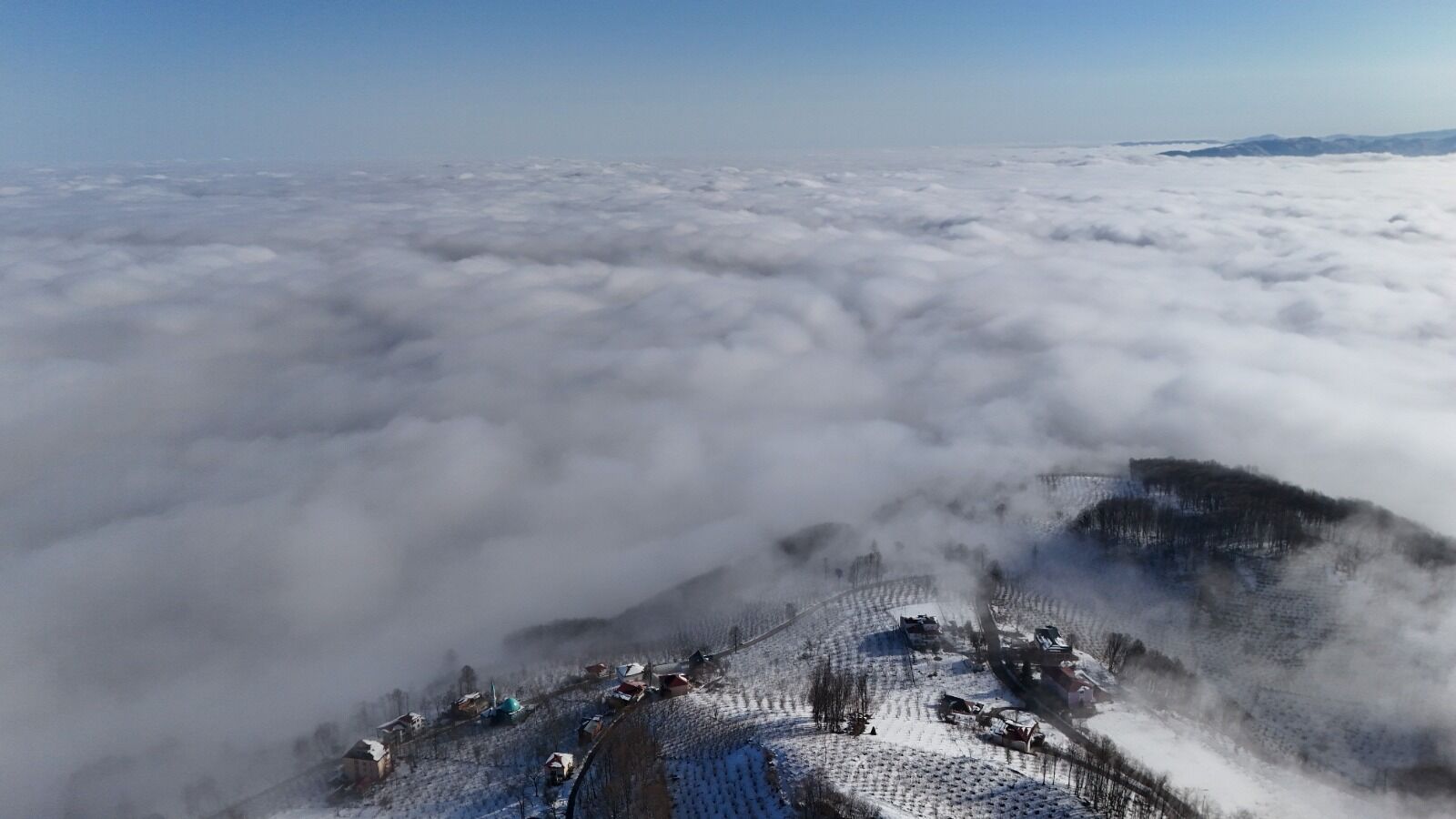 Bölgedeki sis tabakası dron ile havadan görüntülenirken ortaya çıkan görüntüler doğanın sunduğu eşsiz manzarayı gözler önüne serdi.