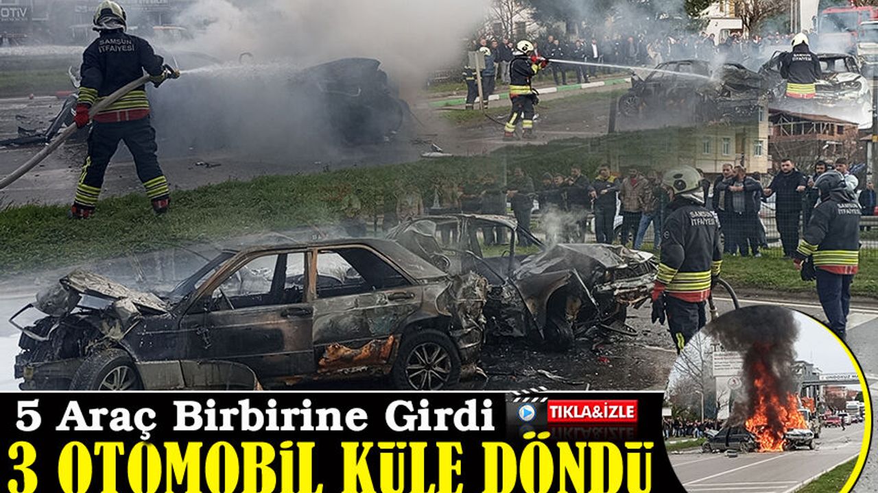 Samsun’un Çarşamba ilçesinde 5 aracın karıştığı zincirleme trafik kazasında 4 kişi yaralandı. Kazanın ardından alev alan 3 otomobil tamamen yanarak hurdaya döndü.