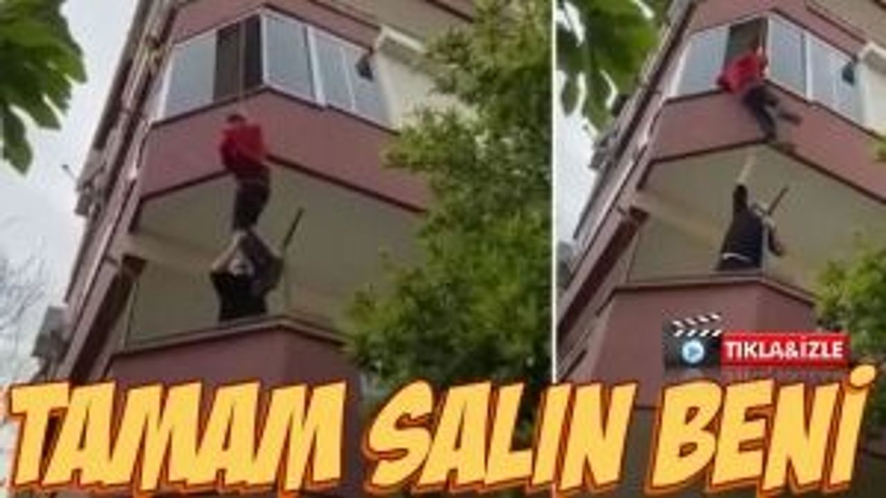 Alt kattaki komşusunun balkonuna çıkıp ipe tutunan genç adam, 3. kattaki arkadaşlarının ipi çekmesiyle...