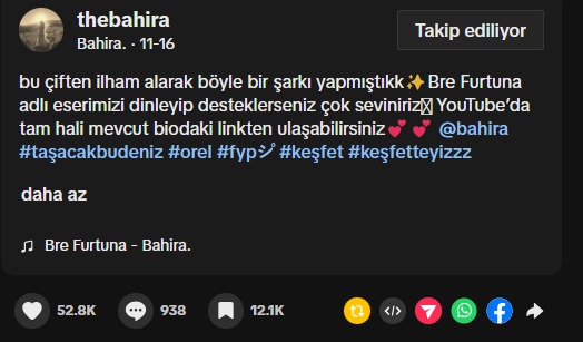 “Biz şarkıyı en başta dizi ekibine ulaşsın ya da etkileşim versinler diye yapmadık aslında. Çift bize ilham oldu, içimizden geldi ve böyle bir şey ortaya çıktı. Bu kadar ilgi göreceğini de hiç beklemiyorduk; sizlerin ilgisi ve desteği bizi fazlasıyla mutlu etti.”