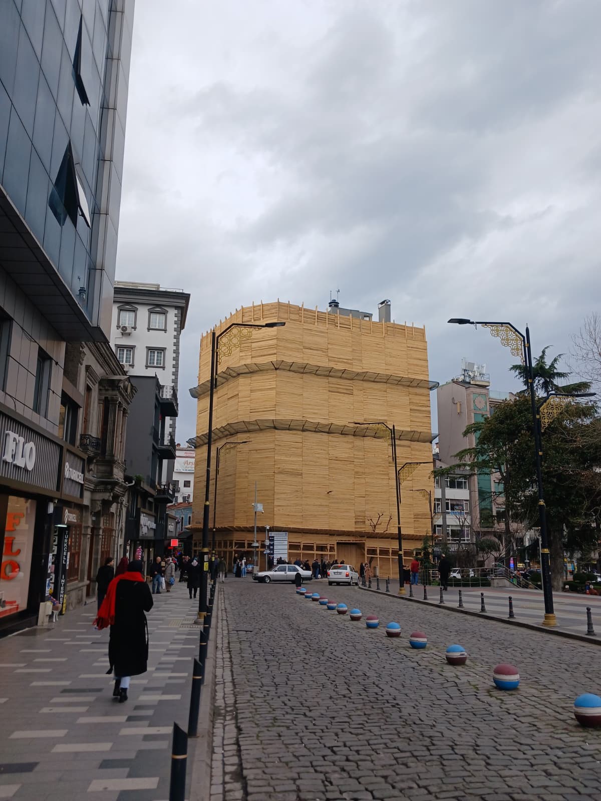Trabzon’un kalbi olarak görülen Uzunsokak, yıllardır hem esnafın hem de vatandaşların buluşma noktası olmayı sürdürüyor. Böyle bir bölgede bir iş merkezinin tamamen kereste ile kaplanması, doğal olarak yoğun ilgi uyandırdı. Binanın dış cephesini saran kalın ahşap malzemeler, ilk bakışta geçici bir inşaat perdesinden çok daha farklı bir izlenim bırakıyor. Uzaktan bakanlar için yapı, sanki büyük bir hediye paketi gibi görünüyor.